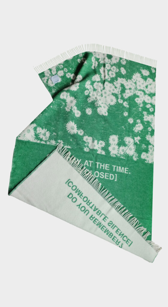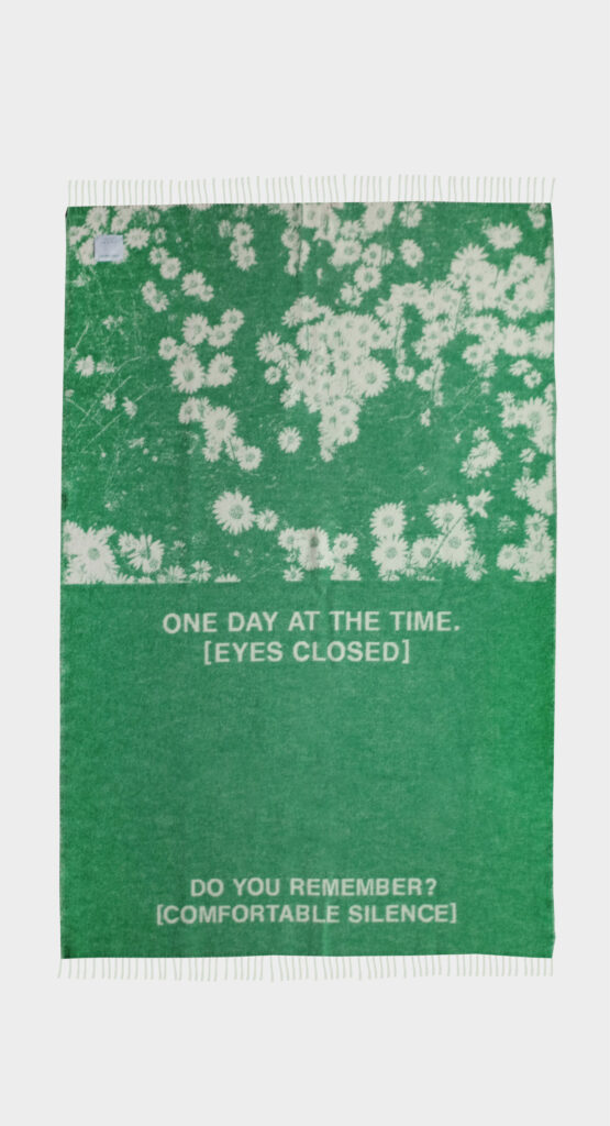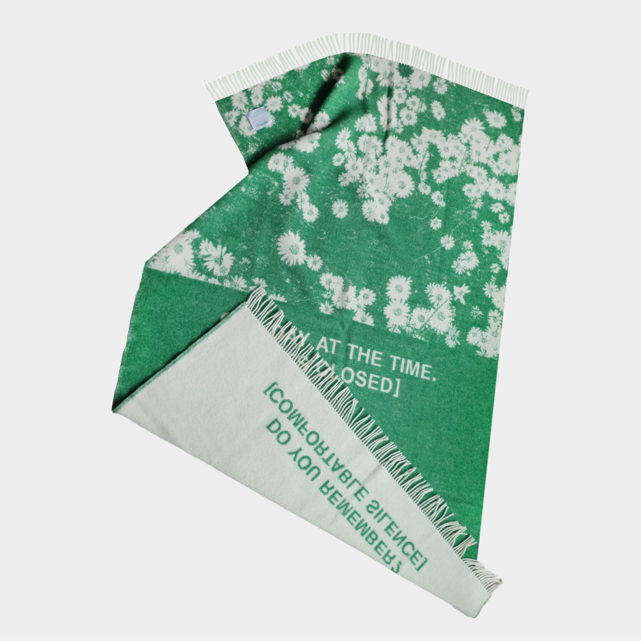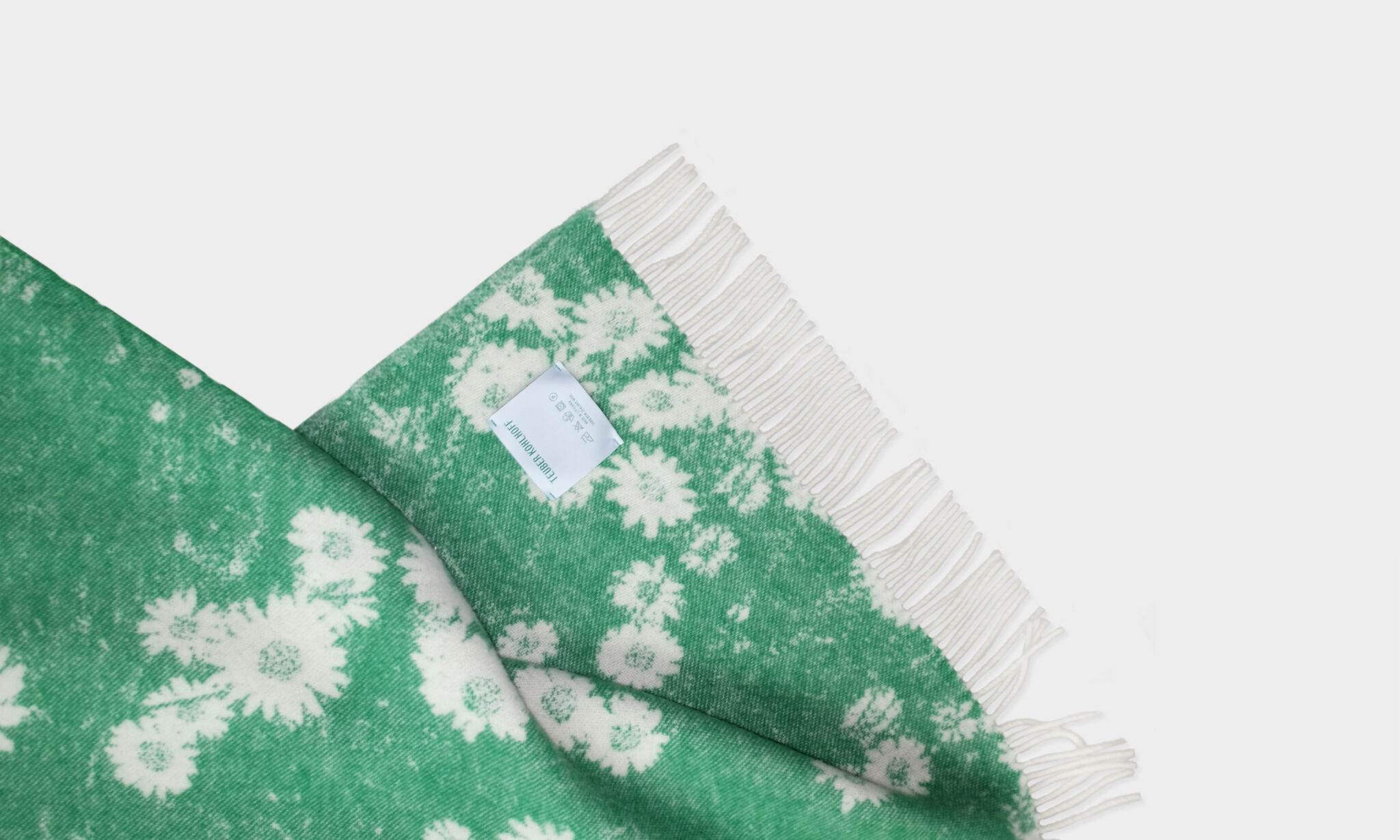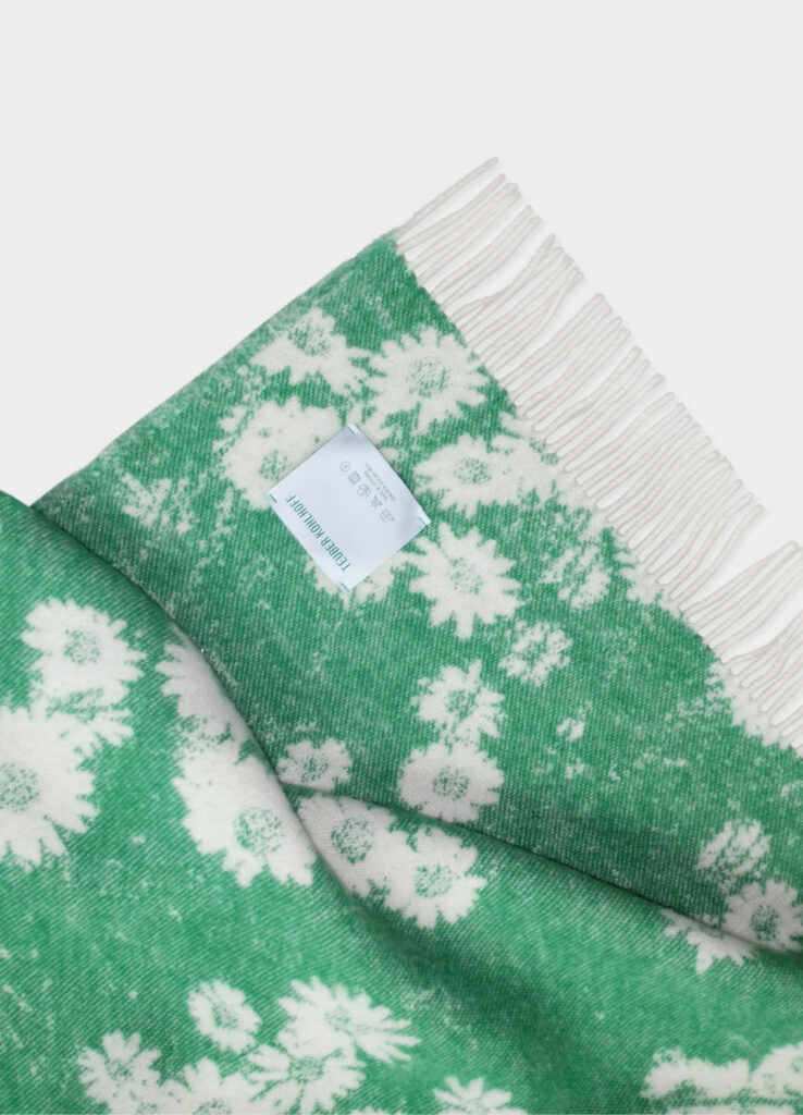 Woven in 100% New Zealand virgin wool, the Meadow blanket captures an intimate memory of late summer in a soft, tactile weave. Its lively green ground evokes sun-warmed grass, with a scattering of daisies drifting across the surface like a quiet afternoon paused in time. Subtle captions introduce a calm, almost cinematic pause — a suggestion of narrative without a fixed story — a gentle reminder of summer’s lushness, preserved in wool.
